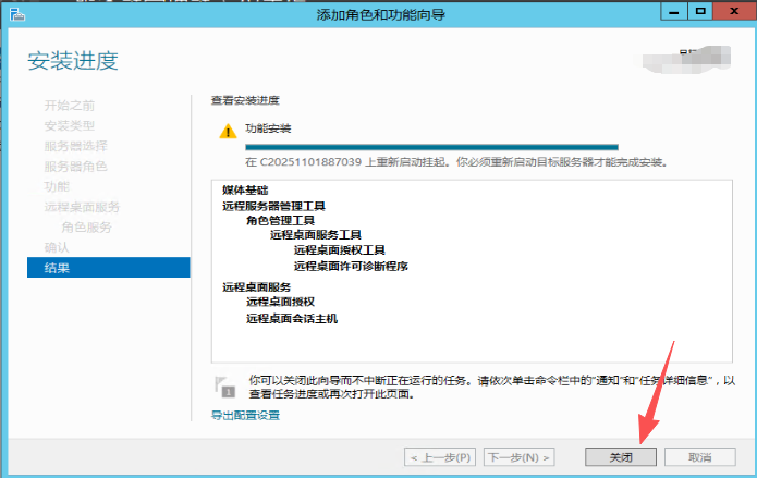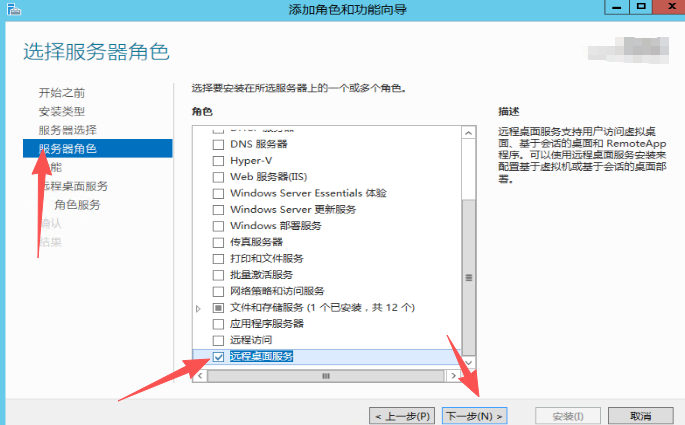 一直点击”下一步“到服务器角色界面,勾选”远程桌面服务“,下一步