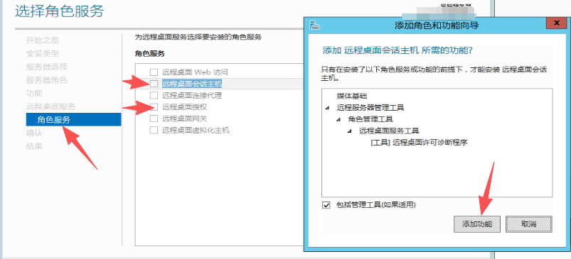 一直点击”下一步“到角色服务,选择远程桌面会话主机,添加功能;再选择远程桌面授权,添加功能。下一步