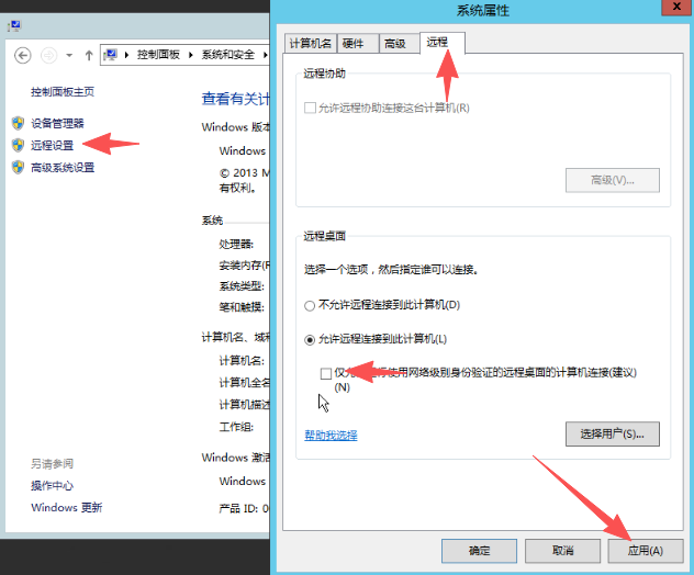 进入后点击远程设置-取消勾选(仅允许运行使用网络级别身份验证的远程桌面的计算机连接)
