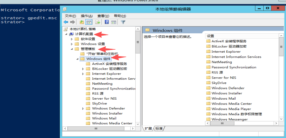 回车。进入”本地组策略管理器“-选择计算机配置-管理模板-Windows组件