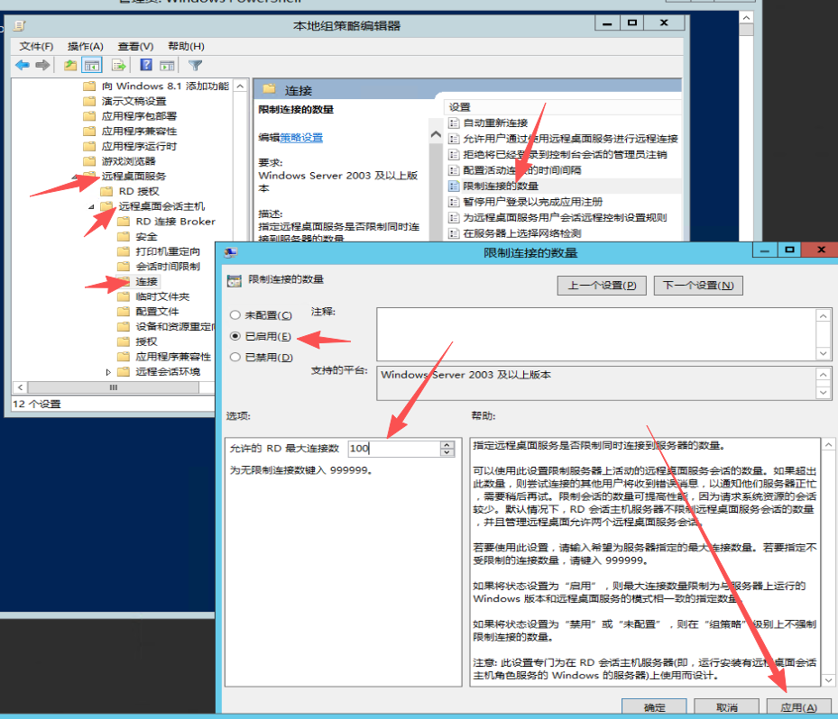 配置已启用,允许RD最大连接数根据自己的需求配置。填完应用即可。然后就可以多桌面了。教程结束!