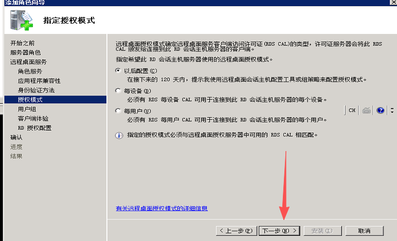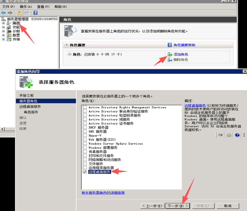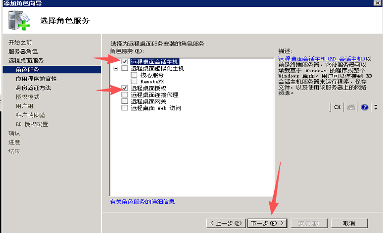 下一步,勾选远程桌面会话主机和远程桌面授权
