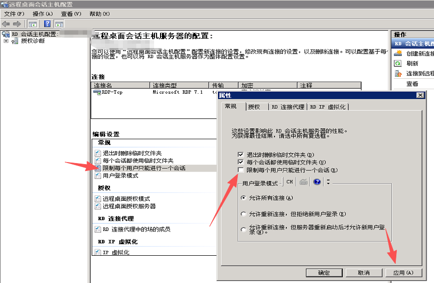 双击 限制每个用户只能进行一个会话,取消勾选 限制每个用户只能进行一个会话,应用设置